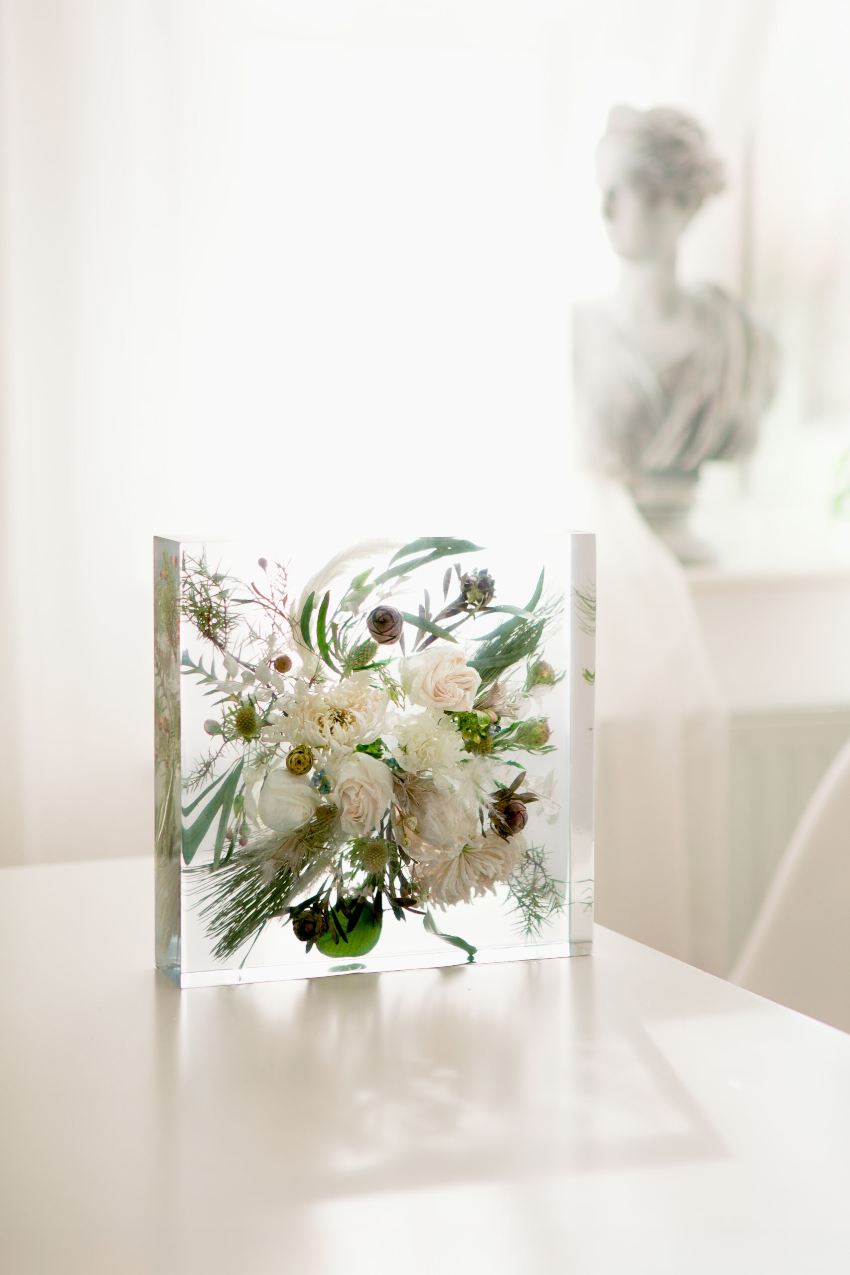 Die Blumen werden bei minus 28 Grad gefriergetrocknet und in mehreren Harzschichten eingegossen. Das Ergebnis: ein glasklares 3D Objekt, in dem jede Blüte geschützt bleibt, ideal für voluminöse Blüten, Sukkulenten und Beeren.