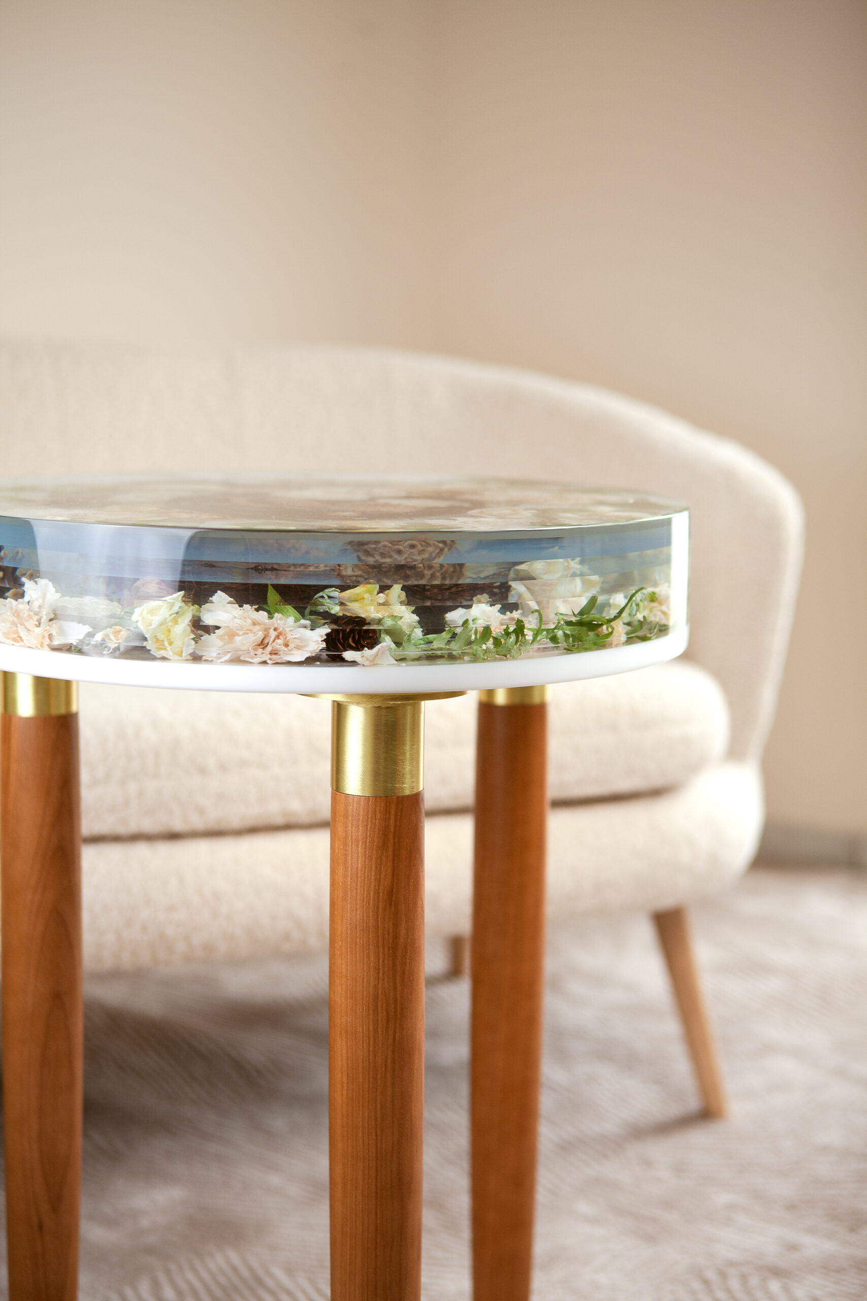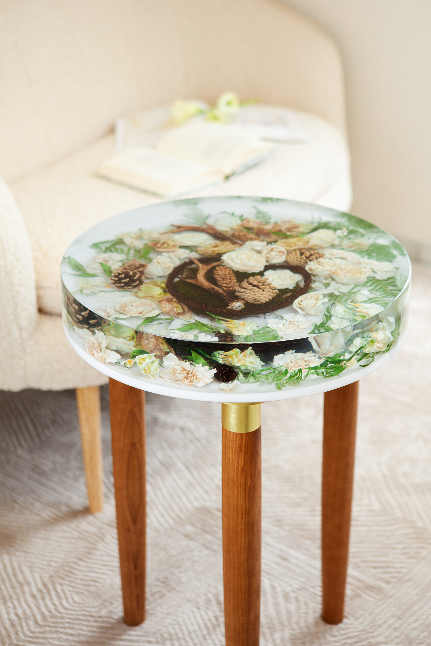 Verwandle deinen Brautstrauß in ein funktionales Kunstwerk! Unser handgefertigter Tisch “Köln” mit 48 cm Durchmesser konserviert deine Hochzeitsblumen in glasklarem Harz – und wird dabei zu einem echten Möbelstück, das du jeden Tag nutzen kannst.